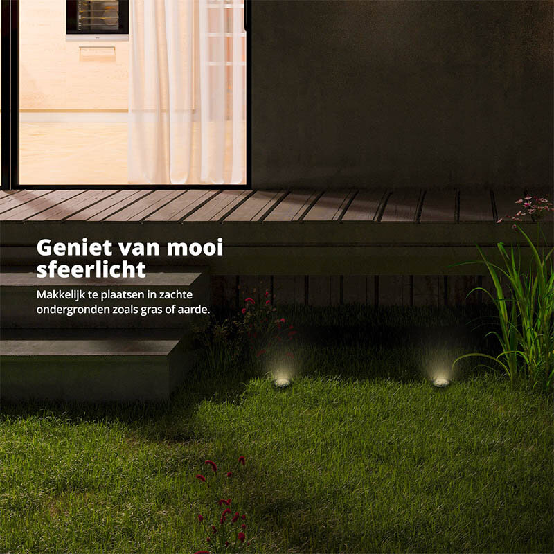 Deze Solar Grondspots zijn precies wat nog ontbreekt in je tuin. Een duurzame en stijlvolle grondlamp die je eenvoudig ter decoratie toevoegt aan je tuinpad of waar je ook wat extra licht verlangt. Deze lampjes zijn nuttig en leuk: ze zorgen voor zicht in het donker en geven iedere tuin een romantische sfeer. Door de automatische lichtsensor zijn ze ook nog eens zeer duurzaam.