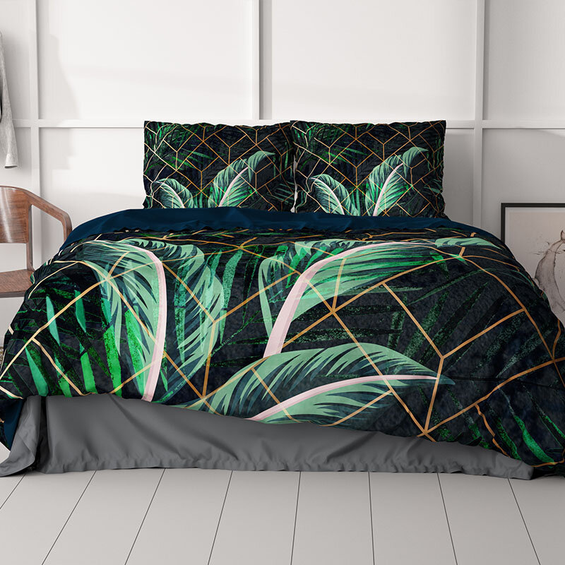 Het Dekbedovertrek Arisha combineert stijl en natuur met een verfijnd geometrisch patroon van tropische bladeren en gouden lijnen op een diepe, donkere achtergrond. Het ontwerp geeft je slaapkamer een moderne, tropische uitstraling die perfect past bij diverse interieurstijlen.