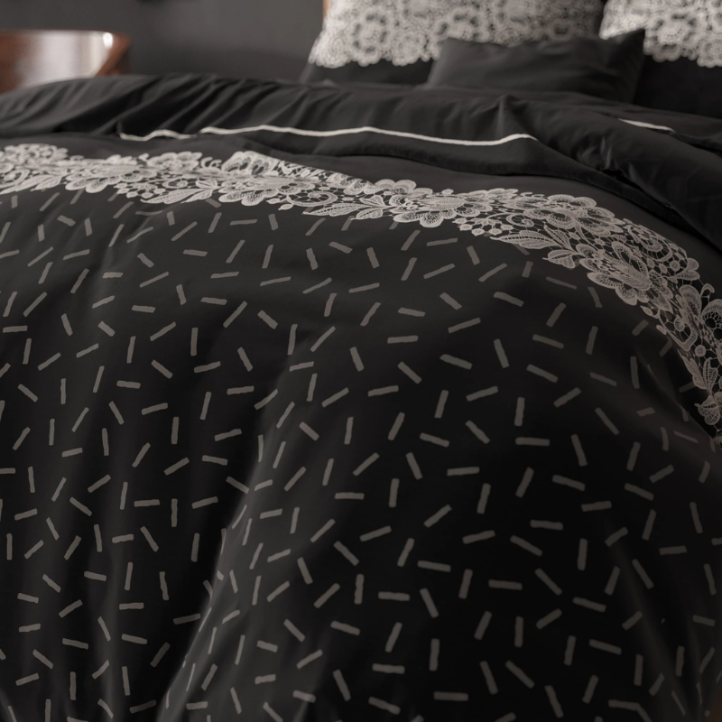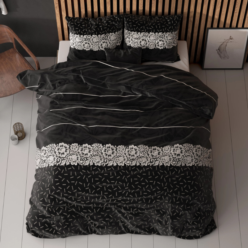 Dit dekbedovertrek met een sierlijk kantmotief en moderne accenten geeft je slaapkamer een chique en stijlvolle uitstraling. Perfect voor een luxueuze en knusse sfeer!