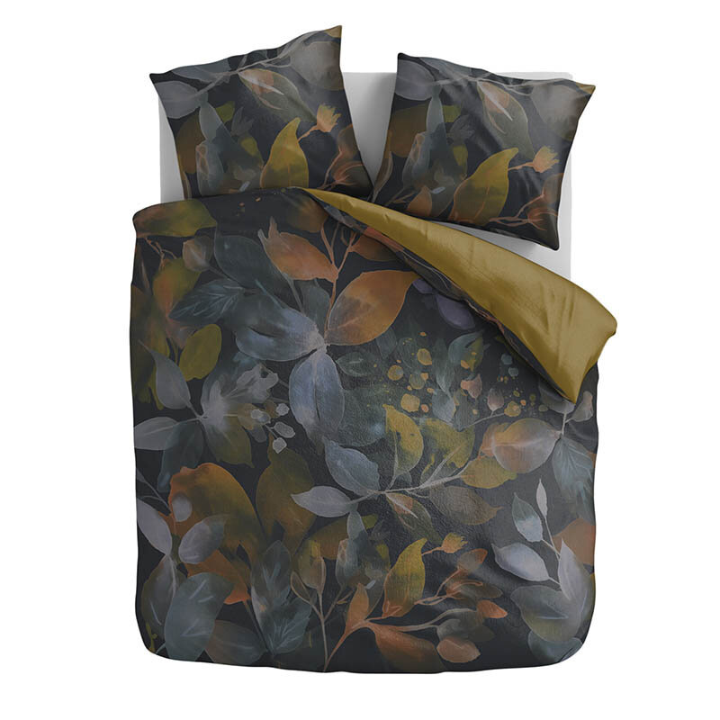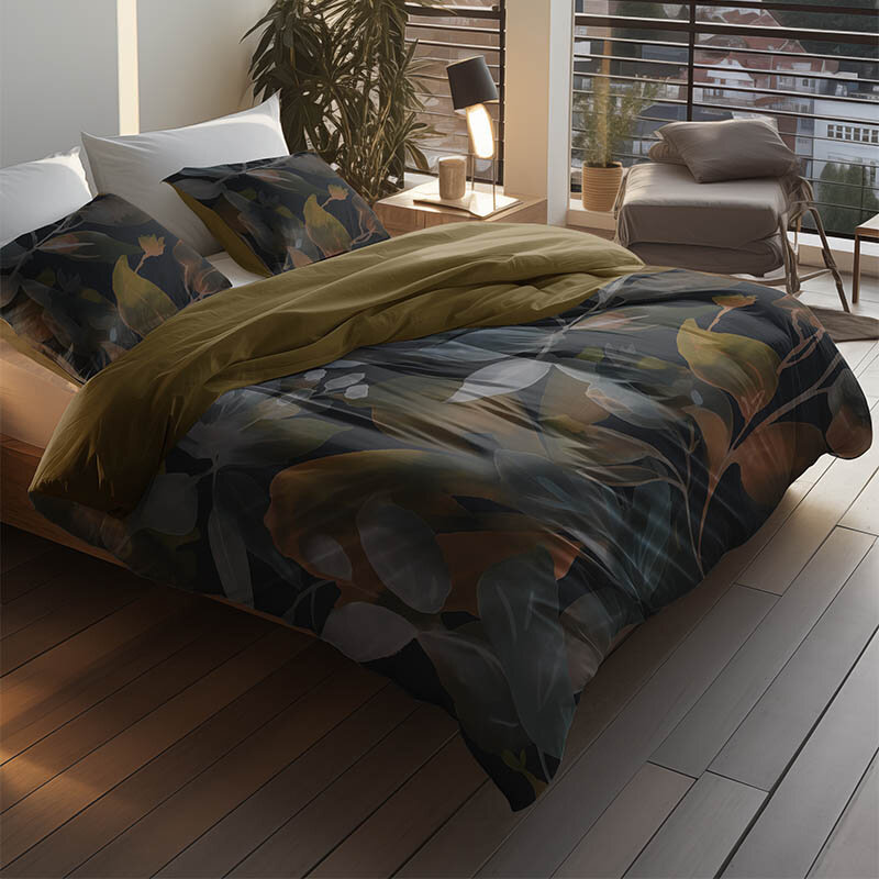 Dit dekbedovertrek brengt een warme en mysterieuze sfeer in je slaapkamer met zijn sfeervolle ontwerp van bladeren in diepe, aardse tinten tegen een donkere achtergrond. De rijke kleuren en het subtiele patroon creëren een elegante en intieme uitstraling, perfect om je interieur een gevoel van comfort en stijl te geven.