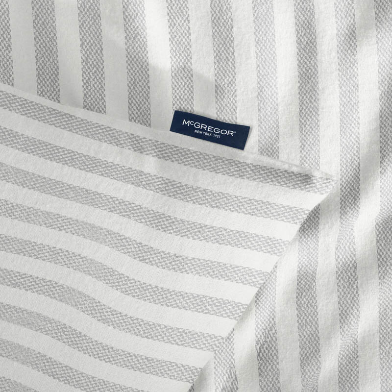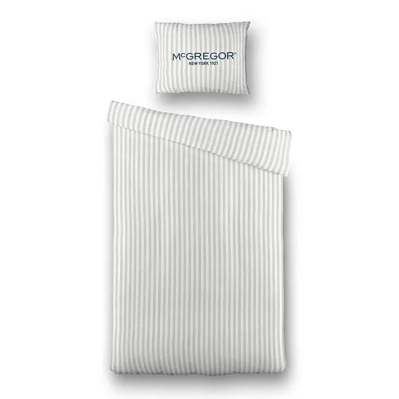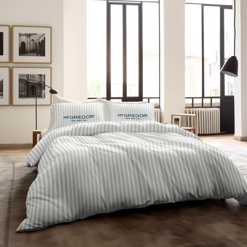 Een stijlvol dekbedovertrek met een klassiek streeppatroon en het iconische McGregor-logo. De ingetogen kleuren en tijdloze uitstraling passen perfect in elke slaapkamer en creëren een frisse, elegante sfeer.