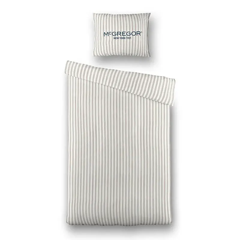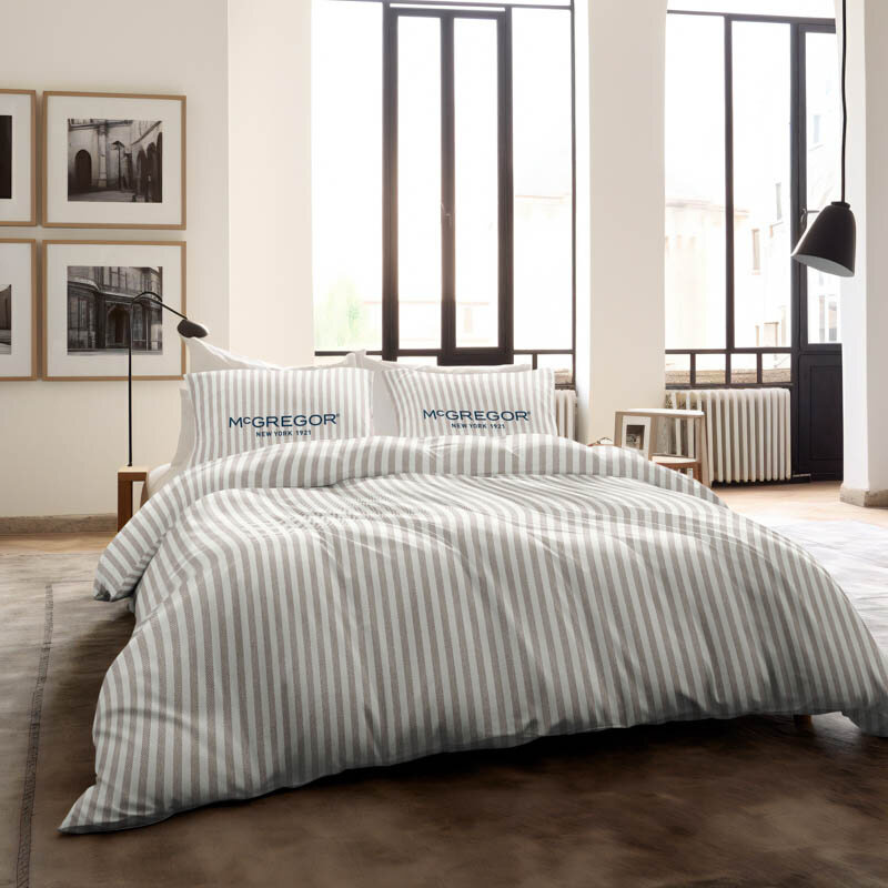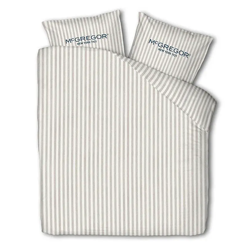 Een tijdloos dekbedovertrek met een verfijnd streeppatroon en subtiel McGregor-logo. De neutrale tinten zorgen voor een rustgevende uitstraling en maken dit overtrek een stijlvolle toevoeging aan elke slaapkamer.