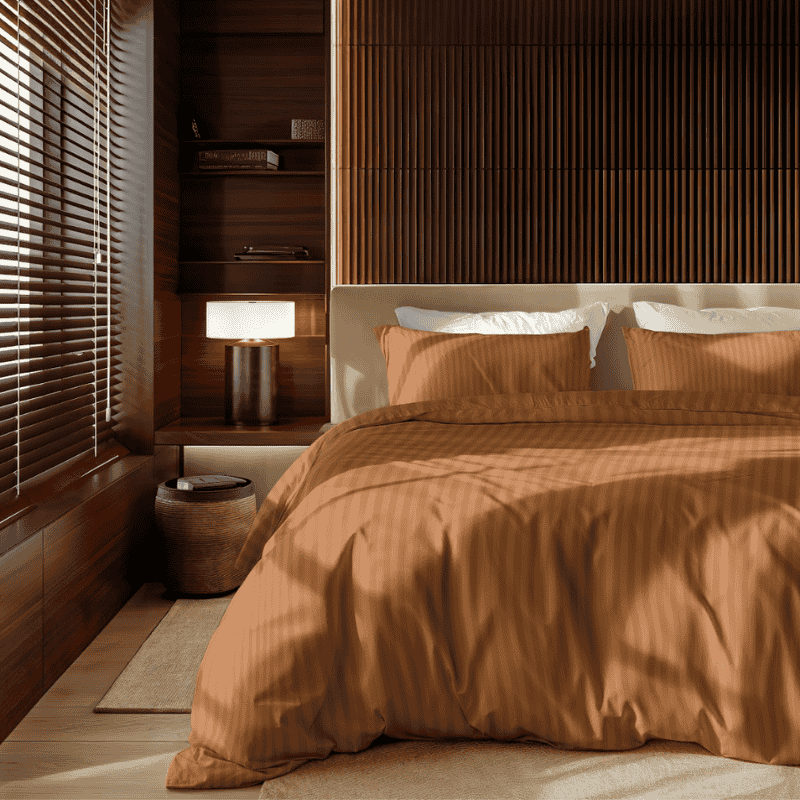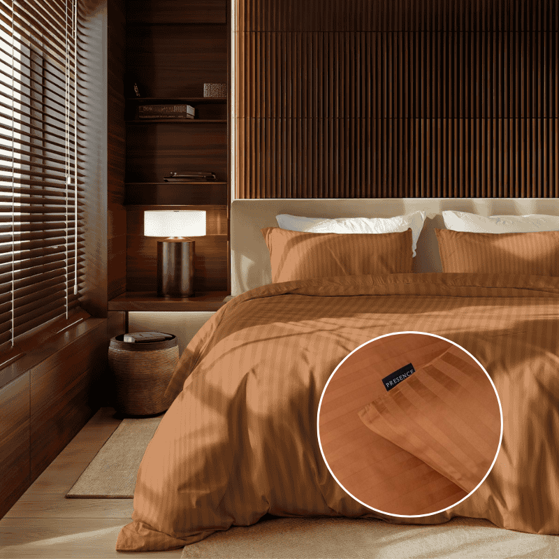 De diepe cognackleur in combinatie met het satijnstreep-patroon geeft je slaapkamer een luxe en uitnodigende uitstraling. Deze warme tint brengt sfeer en elegantie en laat zich perfect combineren met zowel moderne als klassieke interieurstijlen.