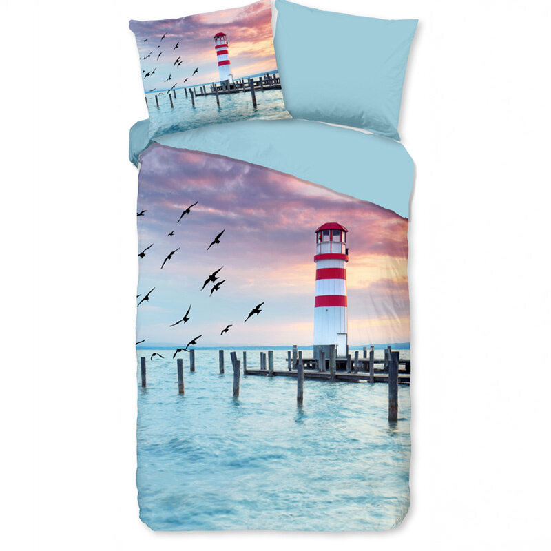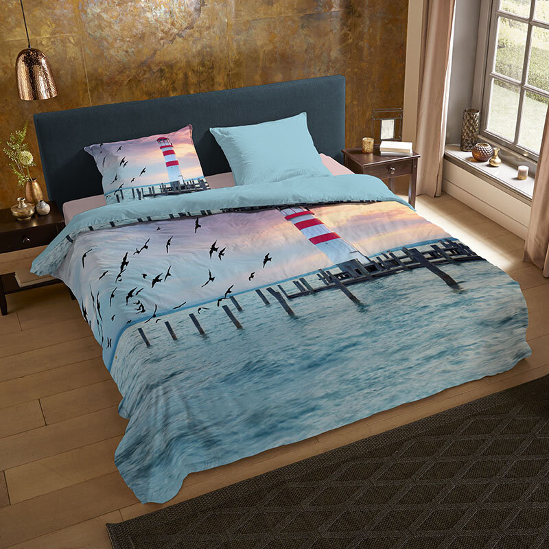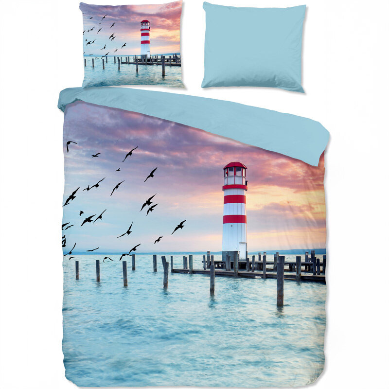 Laat je meevoeren door de rustgevende uitstraling van dit Vuurtoren dekbedovertrek. De prachtige combinatie van blauwe tinten, een sfeervolle zonsondergang en de iconische vuurtoren brengt een maritieme en ontspannende sfeer in je slaapkamer.