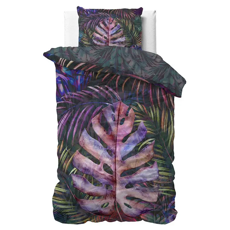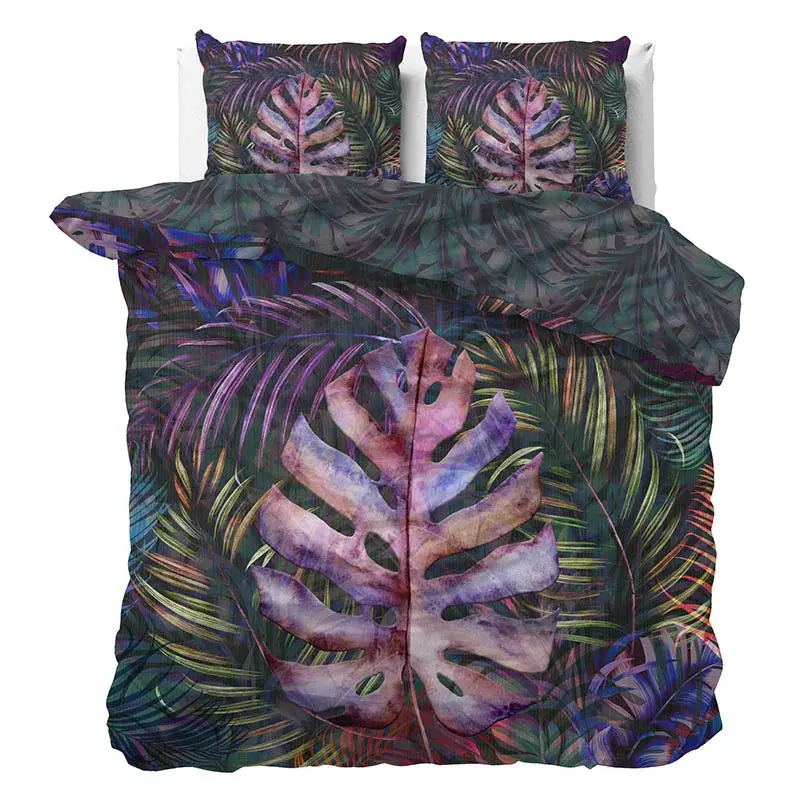Dit dekbedovertrek brengt een levendige en exotische sfeer in je slaapkamer met zijn opvallende ontwerp van tropische bladeren in rijke, kleurrijke tinten. De gedetailleerde patronen en intense kleuren creëren een dynamische en energieke uitstraling, perfect om je interieur een gevoel van avontuur en levendigheid te geven.