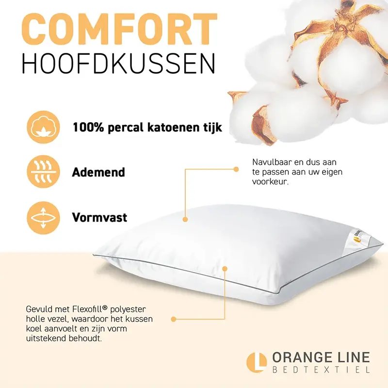Het Orange Line Hotelkussen is gevuld met Flexofill microvezel traagschuim (visco) vlokken. Dit geavanceerde vulmateriaal past zich perfect aan de contouren van je hoofd en nek aan, wat zorgt voor een ideale ondersteuning en comfort. Met een gewicht van 1600 gram biedt het kussen de juiste balans tussen stevigheid en zachtheid, waardoor je de hele nacht door de perfecte ondersteuning krijgt. De traagschuim vlokken zijn ontworpen om drukpunten te verlichten en de bloedcirculatie te bevorderen, wat resulteert in een diepere en meer herstellende slaap. Dit maakt het kussen bijzonder geschikt voor mensen die gevoelig zijn voor nek- en rugpijn.