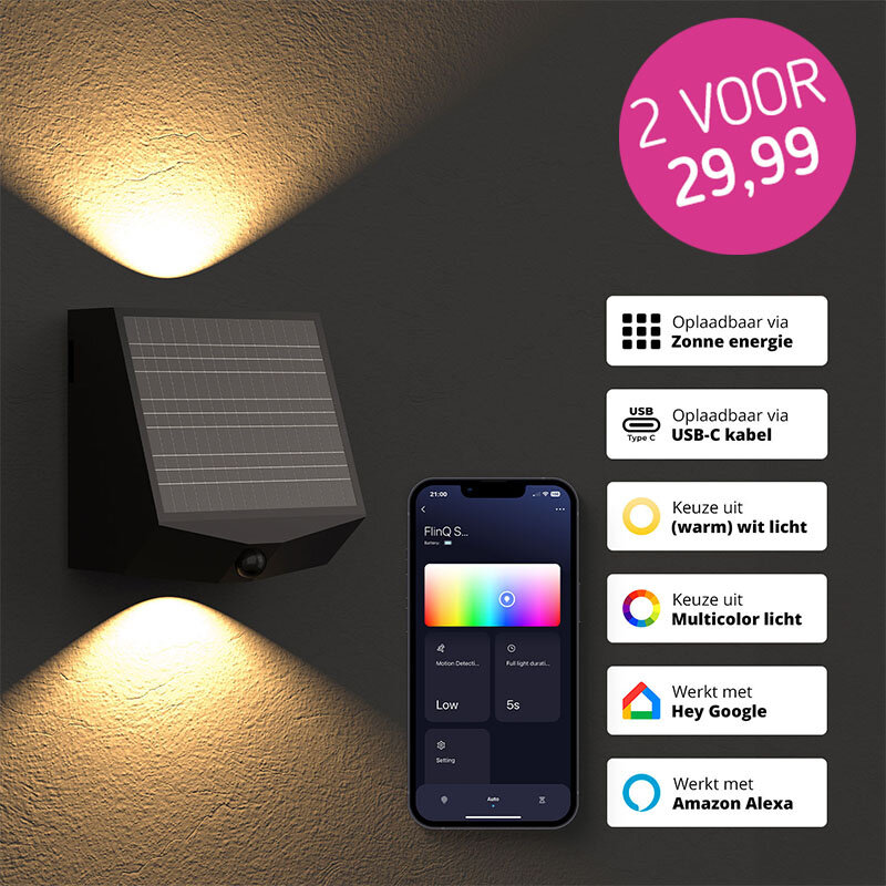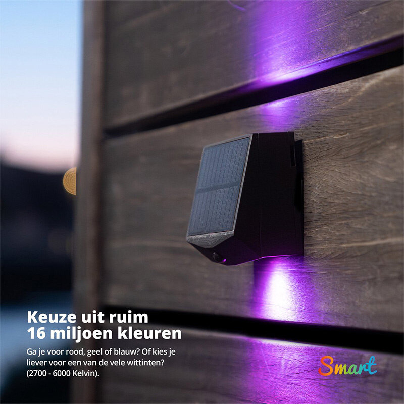 Ben je op zoek naar een buitenlamp die je makkelijk aan de gevel of schutting kunt hangen? Zoek je een wandlamp die je op elke plek kunt ophangen zonder ook maar een kabel te hoeven trekken? Dan kies je voor de FlinQ Luxe Solar Wandlamp. Deze muurlamp beschikt over een LED lichtbron met maar liefst 16 miljoen kleurtinten. Je kunt de buitenlamp daarnaast instellen op warm wit of wit licht.