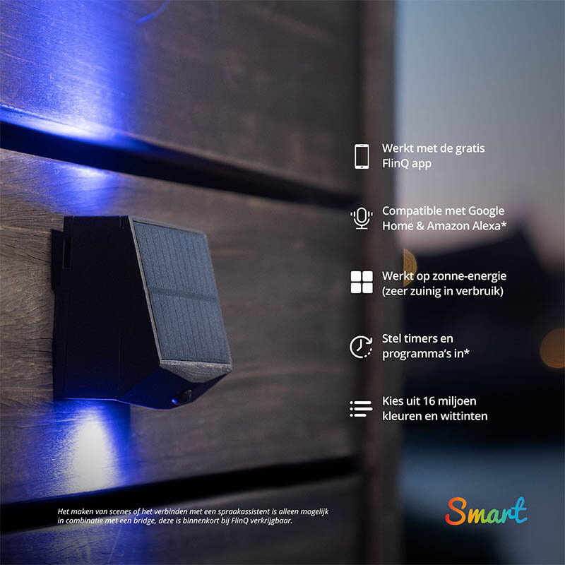 De FlinQ Luxe Solar Wandlamp kun je binnen een minuut koppelen aan de gratis FlinQ app op je telefoon. Deze app is verkrijgbaar voor zowel iOS als Android gebruikers. Na het koppelen krijg je toegang tot tientallen smart functies welke je naar eigen wens kunt instellen.