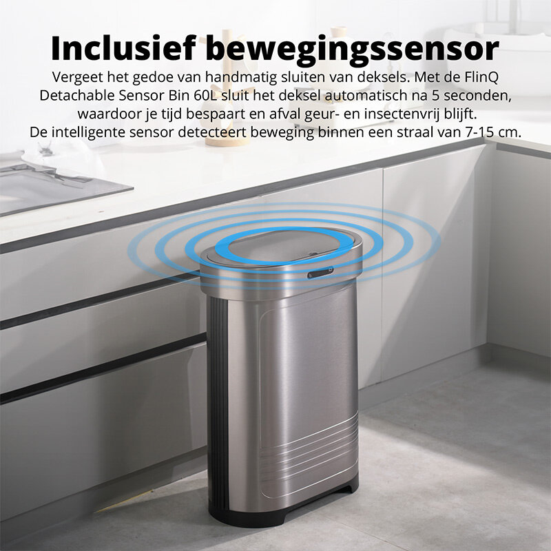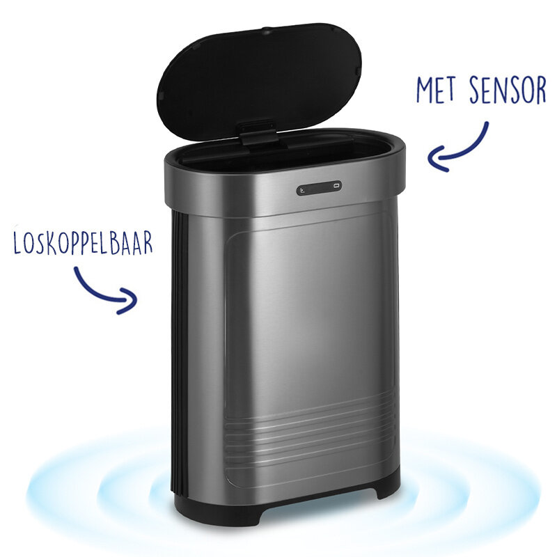 De ingebouwde sensor opent het deksel automatisch als je je hand er dichtbij houdt. Na 5 seconden sluit het vanzelf, waardoor nare geurtjes en vliegen wegblijven. Heb je iets groots te weggooien? Gebruik het handige touchpaneel om het deksel open te houden.