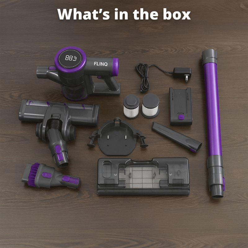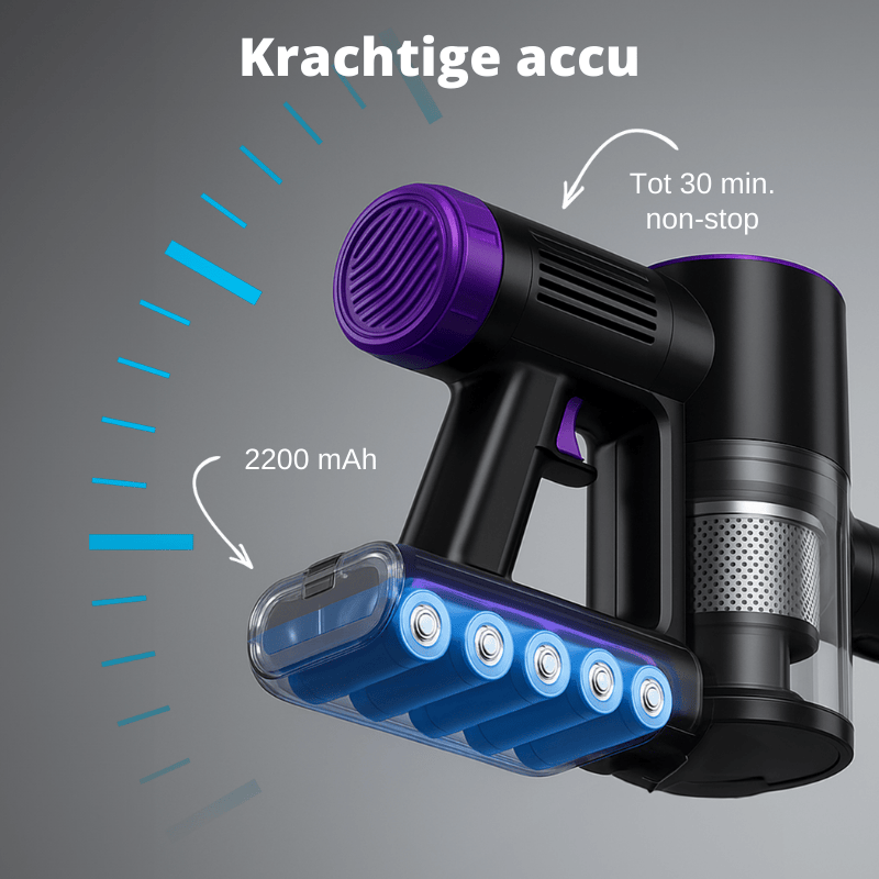 Met een zuigkracht tot 20 kPa verwijdert de FlinQ V8 moeiteloos stof, kruimels, haren en vuil van zowel harde vloeren als tapijt. Dankzij het draadloze ontwerp en de krachtige 2200 mAh accu schoonmaak je tot wel 30 minuten zonder onderbreking.