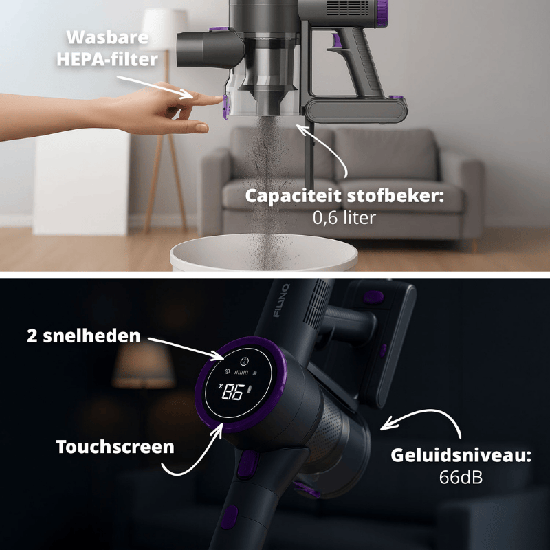 Dankzij het lichte gewicht, het lage geluidsniveau van 66 dB en het hygiënisch te legen stofreservoir is de FlinQ V8 een praktische en comfortabele keuze voor elk huishouden.