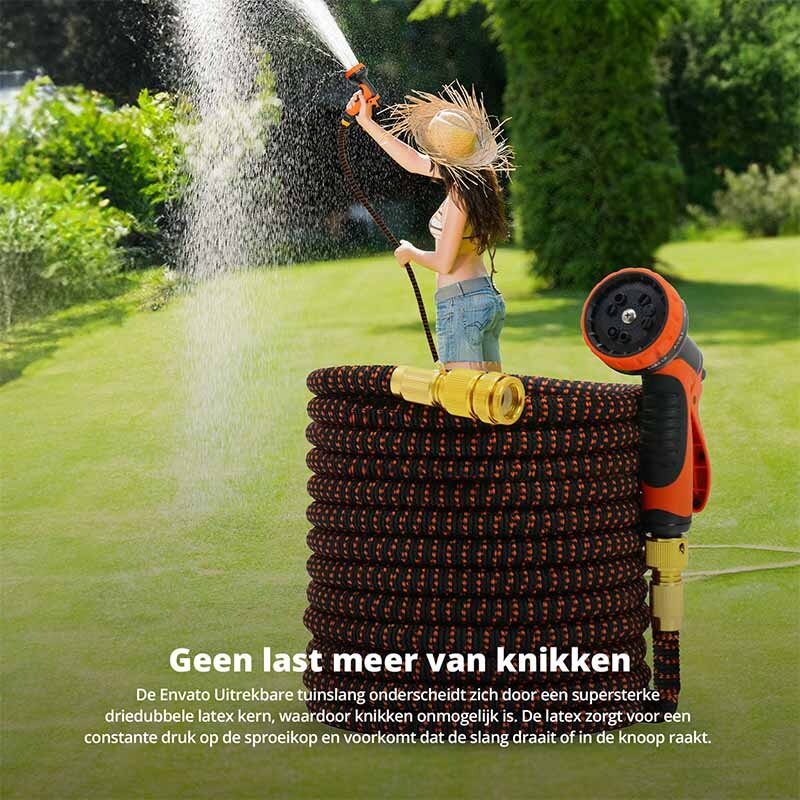 Duurzaamheid staat voorop met de Envato Tuinslang. Het is uitgerust met een supersterke driedubbele latex kern die knikken voorkomt en een constante waterdruk op de sproeikop garandeert. Zo hoef je je geen zorgen te maken over gedoe met draaiende of geknoopte slangen.