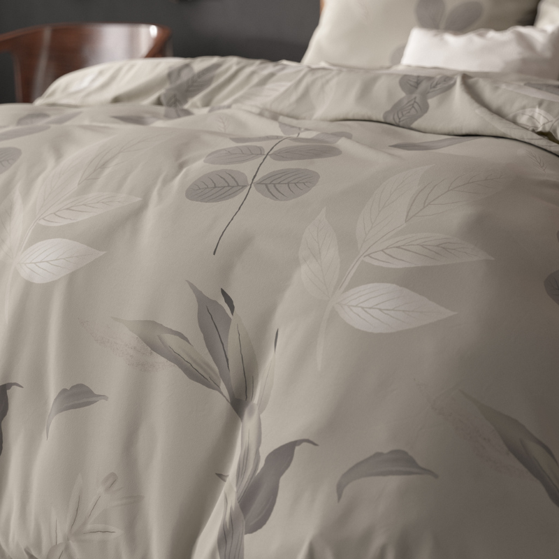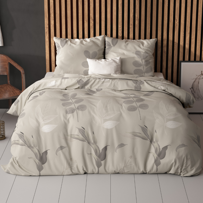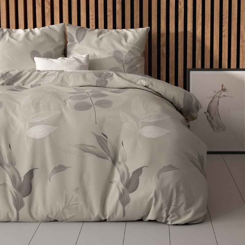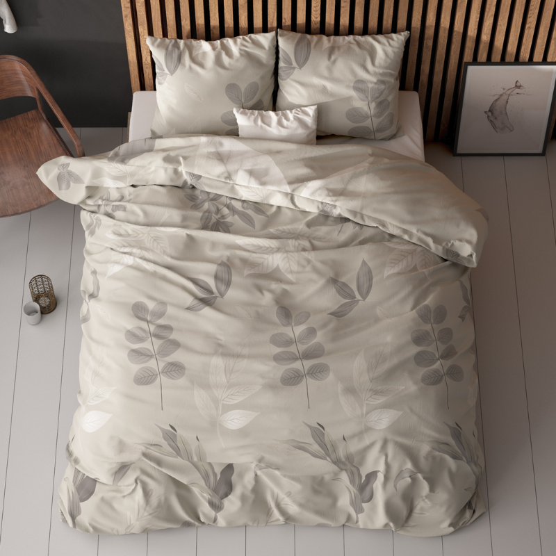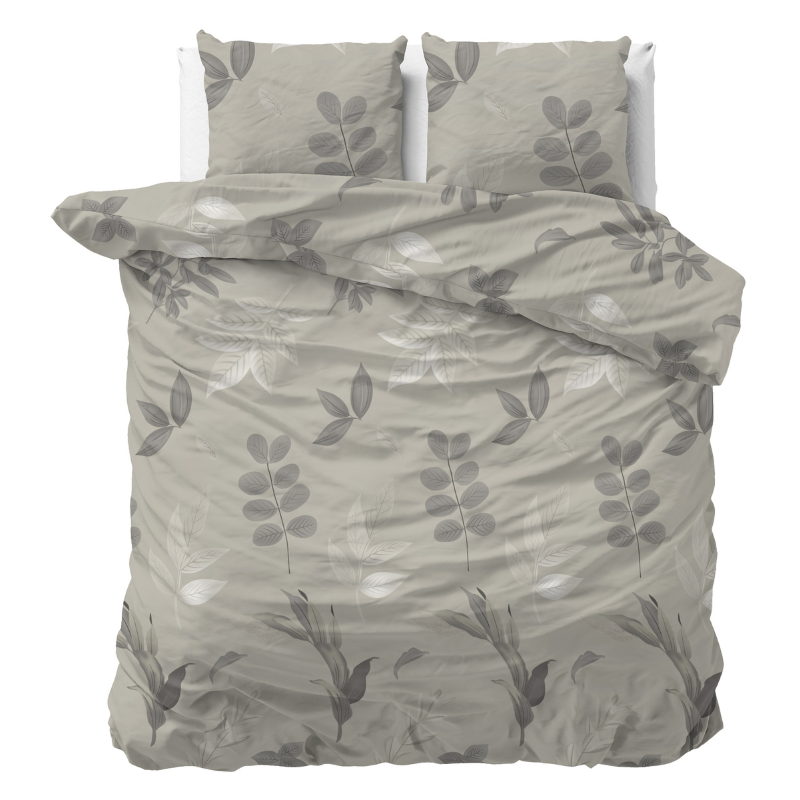 Het Dekbedovertrek Tessa biedt een verfijnde en rustgevende uitstraling met zijn botanische ontwerp in zachte tinten van grijs en beige. De fijne bladeren en bloemenprint zorgt voor een subtiele, natuurlijke sfeer in je slaapkamer, perfect voor wie houdt van een rustige, minimalistische stijl.